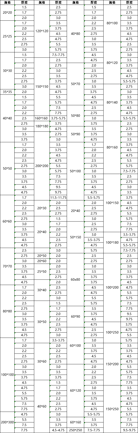 规格齐全灵活:产品规格覆盖全面,边长从 20mm×20mm 至 200mm×200mm,壁厚 2mm-12mm,常规长度为 6m、9m、12m,支持 2-12m 定尺定制,同时可提供方矩管(矩形截面)变种规格,适配不同场景的安装与承重要求。尺寸精度高,截面偏差≤0.5mm,符合 GB/T 3091-2008 等国家标准。​